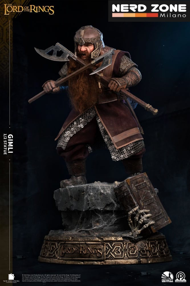 La nuova aggiunta alla Master Forge segue le figure di Legolas 1/2, Gandalf il Grigio 1/2 e il Re Stregone di Angmar 1/2. Come membro della spedizione del Signore degli Anelli, Gimli era un uomo fiero e resiliente che, nel corso della battaglia, strinse una profonda amicizia con l'elfo Legolas e divenne noto come l'Amico degli Elfi. Scortò Frodo Baggins nella distruzione dell'Anello del Potere ed era un guerriero nobile e coraggioso, usando la sua ascia da battaglia come arma.