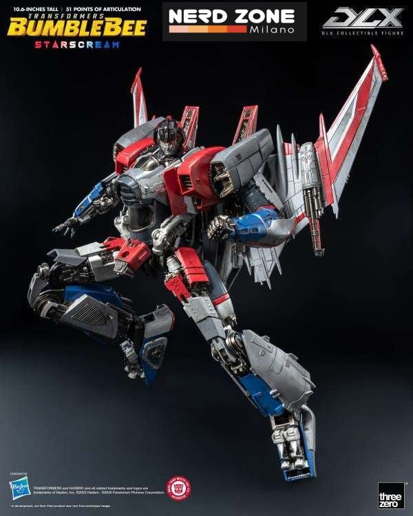 Il DLX Starscream include inoltre diverse mani e armi intercambiabili, tra cui un Null-ray Blaster e una Electron Spike Blade, che permettono di ricreare un’ampia gamma di pose d’azione dinamiche.