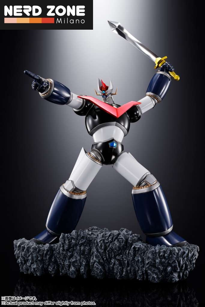 I dettagli di pregio non passano inosservati: le piastre rosse sul petto, la spada di Great Mazinger con lama argentata e impugnatura dorata, e la leggendaria Mazinger Blade, tutti impreziositi da una raffinata finitura metallica placcata che valorizza ulteriormente il set.