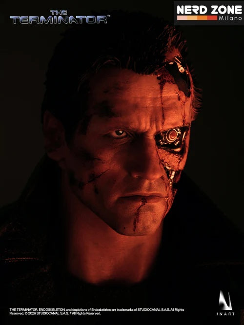 Questa sesta figura da collezione è con licenza ufficiale di STUDIOCANAL S.A.S.. La figura da collezione INART T-800 in scala 1/6 si basa sul suo aspetto iconico in Terminator e presenta il sistema oculare articolato INART. La figura ricrea fedelmente l'aspetto del T-800 fino a ogni minimo dettaglio, unico e fedele allo schermo.